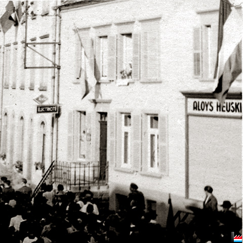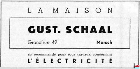 | 6.1948 | Mersch. In unserm Touristenstädtchen werden zur Zeit große bauliche Umänderungen und Modernisierungen an Geschäftshäusern vorgenommen, welche unser Straßenbild bedeutend verschönern. ... In der Grande-Duchesse Charlotte Straße, in der bis jetzt Herr J.P. Schiltz in seinem Hause eine Schlosserei und Schmiede betrieben hat, sind große Umänderungsarbeiten im Gange. Wo Schmiede und Schlosserei untergebracht waren, entsteht ein schönes geräumiges Geschäftslokal. Herr Gustave Schaal, Elektriker aus Mersch, hat diese Geschäftsräume gemietet und wird in nächster Zeit sein bisher im Hause Heuskin betriebenes Geschäft mit elektrischen Artikeln nach dort verlegen. .... (LW: 14.6.1948) | ||