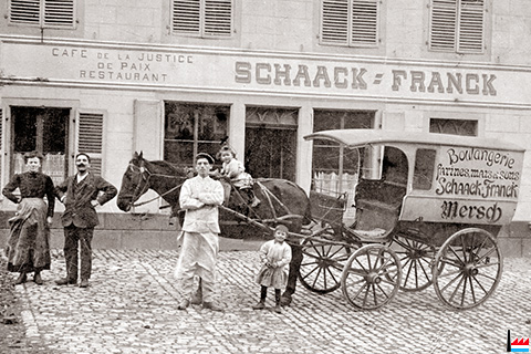 | 1911 | ![]() Café de la Justice de la Paix - Restaurant Schaack-Franck Boulangerie - Pâtisserie - Laiterie (Archives: Nico Lucas) Schaack - Franck ![]() Boulangerie Schaack - Franck, Mersch (Archives: Nico Lucas) farines, mais et sons Mehl, Mais und Kleie |