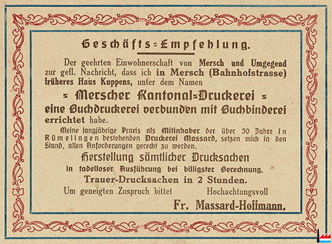 | ~1920 | ![]() Merscher Kantonal-Druckerei Massard-Hoffmann Fr., Mersch, Bahnhofstrasse (rue de la Gare), früheres Haus Kuppens (Collection: industrie.lu) |