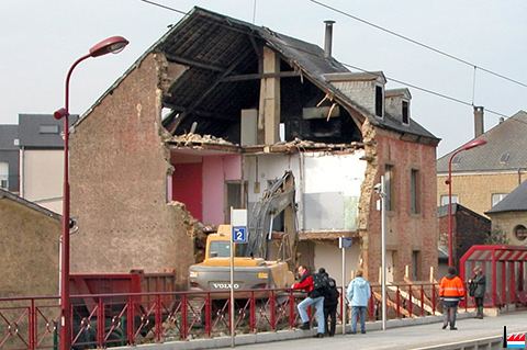 ![]() ![]() Démolition de la maison 20 rue de la Gare, Mersch - vue du Quai de la Gare de Mersch (Photo: 4.3.2004 Nico Lucas) |