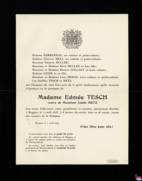 | 7.4.1919 | ![]() Faire-part du décès de Madame Edmée Tesch, veuve de Emile Metz, au Château de Beggen (Collection: industrie.lu) |