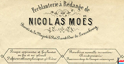 | <1878 | Ferblanterie Nicolas Moës, à Rédange Breveté de Sa Majesté le Roi Grand-Duc de Luxembourg Pompes aspirantes et foulantes en fer et en plomb Fabrique des ouvrages en cuivre, en tôle, en zinc et en fer blanc pour bâtiments, ustensiles de cuisines et objets d'art, etc. |