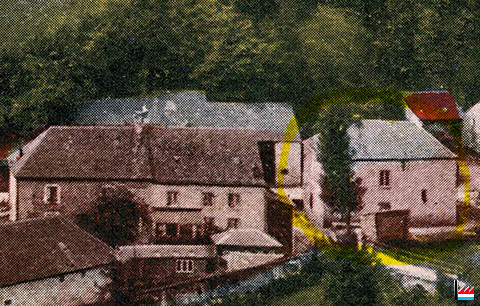 In der Bildmitte: Café Simon, Simmern von hinten - rechts davon die Molkerei (Carte postale: Edition W. Capus, Luxembourg, N° 8; collection industrie.lu)