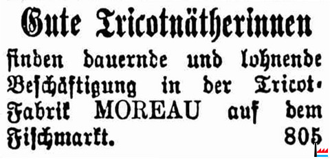 Gute Tricotnäherinnen finden dauernde und lohnende Beschàftigung in der Tricot-Fabrik Moreau auf dem Fischmarkt, Luxemburg (LW: 21.7.1877)