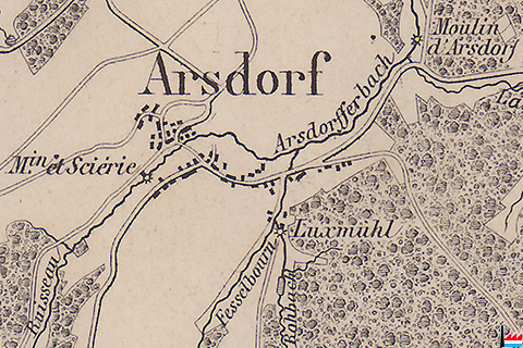 ![]() Arsdorf (Carte Jean-Baptiste Liesch - 1862) Luresmillen - Loresmillen - Luresmühle (Lohmühle) Luxmühl Moulin d'Arsdorf - Bannmillen |