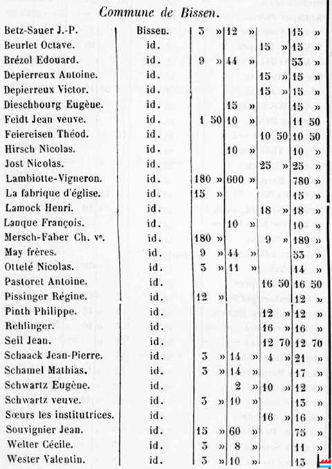 | 1889 | Liste des contribuables imposés à 10 fr. et plus à la contribution mobilière de 1889. Liste der Steuerpflichtigen, welche zu 10 Franken und darüber in der Mobiliarsteuer von 1889 angesetzt sind. ![]() Beurlet Octave (directeur de Lambiotte-Vigneron) - Brézol Edouard (clouterie) - Dieschbourg Eugène (moulin) - Hirsch Nicolas (moulin) - Lambiotte-Vigneron (fabrique d'acide pyroligneux - scierie) - May frères (clouterie) - Mersch-Faber Ch. veuve (tannerie) - Ottelé Nicolas - Pastoret Antoine - Moulin Souvignier Jean (moulin) - Wester Valentin (tannerie) |