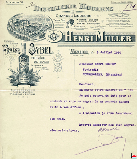 | 1905 | On lit dans un journal de Vésoul : Nous relevons les distinctions dont vient d’être honoré ces temps derniers notre concitoyen M. Muller, distillateur à Vésoul pour sa liqueur «Fraise Sybel» : Exposition Internationale de Liège. - Médaille d'Or. Exposition Internationale des Arts et Métiers de Bruxelles. - Grand Prix. A propos de cette dernière exposition, nous notons le passage suivant la Chronique de Bruxelles du 5 octobre 1905, relatant la visite du roi Léopold II à l’Exposition des Arts et Métiers: Le Souverain reçoit, sur sa demande, des explications sur un nouveau produit, la suave liqueur "Fraise Sybel" qui a obtenu la Médaille d’Or à l’Exposition de Liége. Sa Majesté s’en déclare enchantée. Nos félicitations d’autant plus vives que nous devons à M. Muller la création à Vésoul d’une industrie intéressante pour la prospérité de la ville. (M. Muller est l’ancien directeur de la maison Cointreau à Luxembourg, où il n’a laissé que d’excellents souvenirs) (LIL: 19.12.1905) |