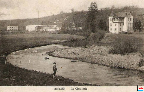 LES USINES DE BISSEN Les usines de Bissen, sont situées à environ 400 mètres du village sur la rivière l’Attert, qui les alimente d’une force hydraulique utilisable d’environ 100 chevaux. Autrefois, elles servaient à la fabrication du fer. Au bois, il y avait plusieurs feux d’affinerie, un haut-fourneau avec four à chaux, utilisant les gaz, fonderie pour la poterie, platinerie, fabrication d’essieux etc,, inexploitées depuis bon nombre d’années. Les bâtiments qui tombaient en ruines furent acquis avec les terrains attenants par M. Kilbourg, ancien entrepreneur et propriétaire à Colmar-Berg. Une partie des constructions fut rasée, et les matériaux servirent à restaurer celles qui sont utilisées aujourdhui. Le bâtiment principal (la vieille forge), mesurant 18 mètres sur 16, a été aménagé pour la clouterie. Une turbine de 40 chevaux, installée dans un angle du bâtiment à la place de l’ancienne roue des feux d’affinerie, sert à activer les machines au nombre de 60 dont 50 en activité. Ces machines sont disposées sur 4 rangs, avec deux lignes de transmissions principales et transmissions intermédiaires pour les accessoires, meules, tambours, machines-outils, etc., etc. Les 50 machines en activité se composent :