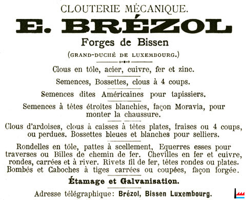 Le tout desservi par un monte-charge automatique. Les bureaux viennent à la suite et se trouvent à proximité du magasin, avec le logement du comptable. Un peu à l’écart un autre bâtiment avec grande cheminée pour le four à recuire de fil de fer, et turbine de 15 chevaux qui va être utilisé comme tréfilerie. Une troisième turbine en construction sera également placée dans le grand bâtiment déjà mentionné et donnera la force supplémentaire nécessaire pour activer les 10 machines au repos et celles en construction. Dernière l’usine se trouve une cité ouvrière, ce qui permet de loger une partie du personnel. Plus loin, deux maisons d’habitation avec jardin et fort bien aménagées servent l’une de demeure de la famille Brézol, l’autre de pied à terre à M. Hodez. L’établissement est exploité par la société et sous raison sociale E. Brézol et Cie avec le titre de "Clouteries franco-luxembourgeoises". Le matériel pour les clous en tôle, semences de tapissiers et autres et partie du matériel pour les pointes, a été cédé par M. Blanchet, beau-frère de M. Brézol, maître de forges à Lille. Autrefois directeur de la clouterie de la forge Nouzon (Capital 600.000 frs.) M. Brézol est le fils et le neveu des Brézol des Ardennes. Les frères Brézol sont les inventeurs des machines à clous; leur premier brevet est daté du 1er avril 1850. Ils sont créateurs de cette industrie ; on leur doit son grand développement tant en France qu’à l’étranger. Les importantes usines de Mohon, St-Marceau, la forge Mohon, la forge Nouzon ont été fondées par eux, comme plusieurs autres en Belgique, Hollande, Allemagne sont dues aussi à leur collaboration. M. Brézol est arrivé, il y a 7 ans environs (donc vers 1886/87) dans le Grand-Duché de Luxembourg pour installer l’usine de M. Hodez à Ettelbruck. Cette installation terminée, M. Brézol fit l’acquisition de 10 machines à semences tapissiers, qui furent placées à Bissen. L’usine était louée par moitié avec les frères May, qui eux faisaient le clou des chaussures pour leur compte. Comme chaque jour l’industrie de M. Brézol prenait du développement grâce à une fabrication irréprochable, reconnue supérieure, même par la concurrence, plusieurs machines furent mises en construction, si bien que, lors de la constitution de la société, leur nombre était de 25 c’est-à-dire 15 machines entièrement construites dans les usines de Bissen. Eu égard aux éléments dont il disposait et de l’aveu même d’hommes compétents. M. Brézol a accompli là un véritable tour de force. Seul, sans employé, sans contremaître, menant de front l’instruction du personnel, l’installation de l’usine, la construction des machines, organisant les débouchés, il a débuté avec une vente de 39.000 kilos la première année, 100.000 k. 118.000 k., 120.000 k. et enfin 142.000 k. vendus en moyenne 50 frs. / 100 kilos, la 5e année. C’est en payant de sa personne, toujours sur la brèche, par sa persévérance et ne se laissant, rebuter par aucune difficulté que M. Brézol a obtenu ce résultat. Cette partie constitue donc un bon appoint pour la société et nous souhaitons que M. Brézol puisse continuer la tâche qu’il a, si bien préparée. Nous avons parlé du matériel de M. Hodez ; il a été ramené de Châtel-St-Germain, et quoique les machines aient été atteintes par le feu, leur réfection complète opérée à Bissen, permet d’obtenir un produit parfait pouvant rivaliser avec n’importe lequel similaire, allemand, français ou belge. Non seulement la fabrication est supérieure comme fini, mais le rendement est le double de celui obtenu autrefois à Ettelbruck. La fusion de l’affaire Brézol avec celle de M. Hodez permet d’offrir à la clientèle toute la clouterie général en fer, acier, cuivre, zinc, aluminium. Clous, fil de fer à tiges extra réduites en tous genres. Clous en tôle, fer, cuivre, zinc, semences-bosselles, semences à petites têtes Moravia, pour monter la chaussure, chevilles en fer et cuivre, rondes, carrées et à river. Pointes et clous d’ardoises, pointes fines et petites ferronnerie, clouterie forgée. Plusieurs brevets allemands, belges, français, et luxembourgeois obtenus par M. Brézol sont une garantie de la propriété des machines perfectionnées que la société emploie. La production mensuelle pourra arriver à 30 mêmes 35.0000 kg dans un délai très rapproché. Faisons remarquer que les clous de tôle ne donnent pas de poids puisque certains numéros comptent 1000 clous aux 40 grammes. Les usines de Bissen occupent actuellement 40 ouvriers. Notons en passant, qu’un seul homme avec un gamin peuvent conduire 5 machines à clous tôles et un ouvrier pour 2 machines fil de fer. Le reste du personnel comprend ajusteurs, emballeurs, manœuvres, gamins et gamines. Nous verrions avec plaisir l’installation d’un laminoir à tôle et à fil de fer dans le Grand-Duché pour qui, en dehors de la consommation des quincailleries et autres, l’alimentation des usines de Bissen serait une bonne réserve, étant donné l’accroissement journalier de ces établissements. (LIL: 2.7.1894) |