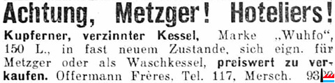| 1939 | ![]() Molkereien! Beugen Sie vor! Damit Sie Ihren Betrieb nicht infolge von Maul- und Klauenseuche zu schliessen brauchen. Schaffen Sie sich hierzu einen unserer bewährten Milchabkochkessel an. Von unserm neuesten 500 Liter Modell stehen schon mehrere zur vollsten Zufriedenheit in Betrieb. Alleinhersteller: OFFERMANN Frères, BERINGEN-MERSCH, Telefon 117 |