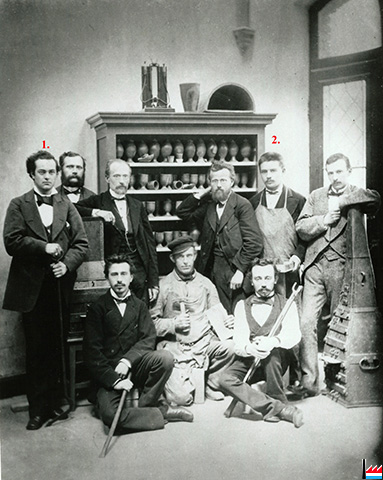 | um 1875 | 1. Constant de Muyser. 2. Frédéric Kintzlé - In einer Werkstatt in Aachen (reproduction) - (Archives privées Guy de Muyser, Luxembourg) |