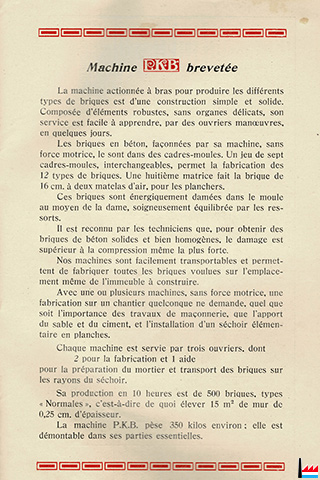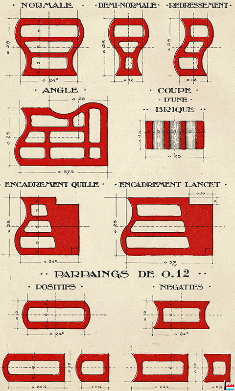| 9.1922 | Brevet d'invention N° 12817 - 12 septembre 1922 - Machine pourvue d'un moule multiple permettant de mouler des briques de toutes formes et de toutes dimensionscouramment employées dans la construction. Brevet d'invention N° 12818 - 12 septembre 1922 - Brique creuse et systèmes de construction réalisés avec cette brique. - La même. |
