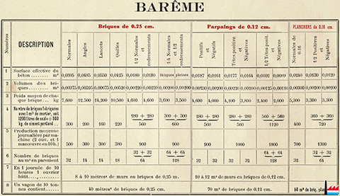 Résultats d'essais de briques creuses PKB en mortier de ciment (300 kg de ciment de Portland pour 1200 litres de sable grenu et lavé) du laboratoire fédéral d'essai de matériaux, annexé à l'Ecole ploytechnique suisse, Zurich (Collection: industrie.lu):![]() |