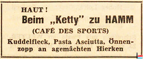 | <=1964 | ![]() HAUT! Beim „Ketty” zu HAMM (CAFÉ DES SPORTS) (LW: 8.10.1964) Kuddelfleck, Pasta Asciutta, Önnenzopp an agemâchten Hierken |