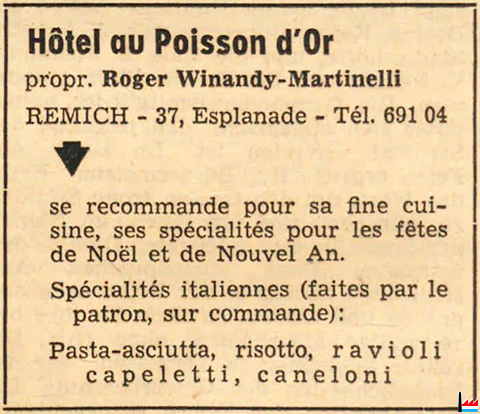 se recommande pour sa fine cuisine, ses spécialités pour les fêtes de Noël et de Nouvel An. Spécialités italiennes (faites par le patron, sur commande): Pasta Asciutta, risotto, ravioli, capeletti, caneloni (LW: 24.12.1957) |
