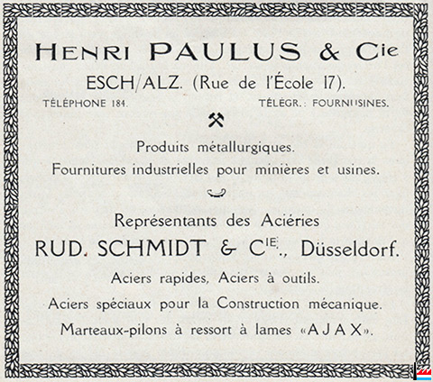 ![]() Henri Paulus & Cie, Esch/Alzette, 17 rue de l'Ecole - 1922 (Publicité - Collection: industrie.lu) Représentants: Aciéries Rud. Schmidt & Cie, Düsseldorf, Marteaux-pilons à ressort à lames AJAX |