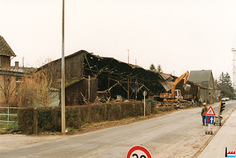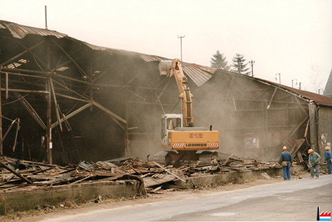 Abriss der ehemaligen Parkettfabrikationshalle von Hoffmann-Schaedgen bei Pedinotti als Garage für Lastwagen und Baumaschienen Foto 7-12-1995 |