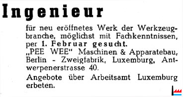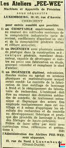 | 1946 | Administration des Ateliers Pee-Wee sous séquestre 19 rue du Nord, Luxembourg |