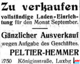| 7.1914 | ![]() Ausverkauf wegen Aufgabe des Geschäftes Peltier - Hemmer |