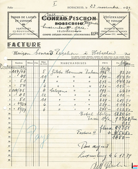 | <=1938 | ![]() Bernard Kuschmann, Luxembourg, 23 avenue de la Liberté - facture du 12.2.1938 à la Maison Conrad Peschon, Hobscheid (Collection: industrie.lu) |