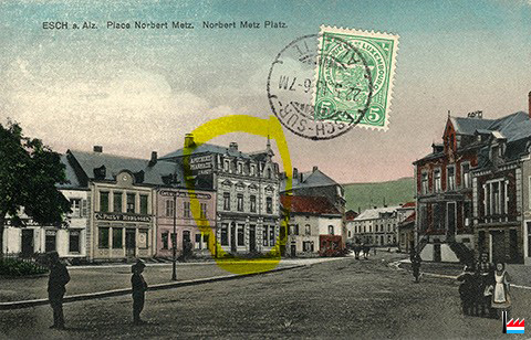 Esch/Alzette, place Norbert-Metz - Norbert Metz-Platz - <=1913 (Extrait carte postale: M. Maroldt, Esch s. Alz, 8 rue de la Poste, A 9711 10; collection: industrie.lu)