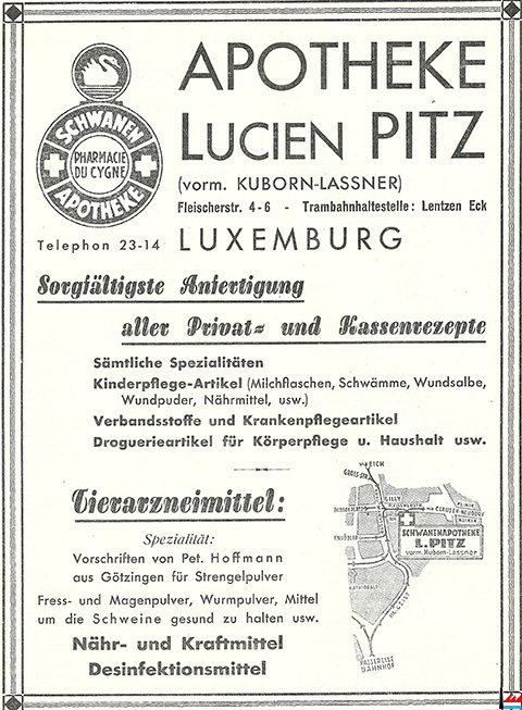 | 1933 | ![]() 1933 - Apotheke Lucien Pitz (vorm. Kuborn-Lassner) - Schwanenapotheke - Pharmacie du cygne (In: Luxemburger Marienkalender 1933 57. Jahrgang) |