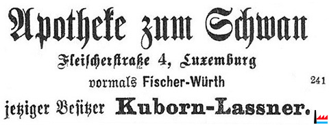 | 1896 | ![]() Apotheke zum Schwan - Fleischerstraβe 4, Luxemburg - vormals Fischer-Würth - jetziger Besitzer Kuborn-Lassner (LW: 18.4.1896) |