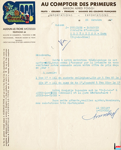 | ? - 1957 - ? | Au Comptoir des Primeurs Maison Alfred Poggi Audun-le-Tiche, Moselle Tél: 64 ![]() ![]() Au Comptoir des Primeurs - 1957 (Collection: industrie.lu) Maison Alfred Poggi Audun-le-Tiche, Moselle Tél: 64 A. Winckel, gérant |