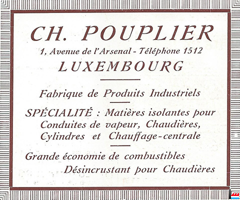 | <=1913, 1918 | Charles Pouplier - Fabrique de produits industriels - 1 avenue de l'Arsenal, Luxembourg (Arsenalstrasse 1) |