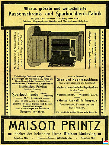 | 1907 | Maison Printz Inhaber der bekannten Firma Maison Bodeving Älteste, größte und weltprämierte Kassenschrank- und Sparkochherd-Fabrik Fabriken: Neypergstraße, Bahnhof und Mercierstraße, Hollerich |