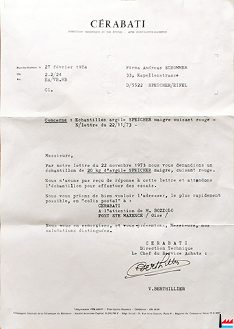 | 27.2.1974 | ![]() Lettre de Cérabati, Pont-Sainte-Maxence / Oise (Berthillier) à Andreas Schommer, Speicher, 33 Kapellenstrasse - concernant un échantillon de 20 kg d'argile de Speicher (Collection: Wilhelm Schommer) |