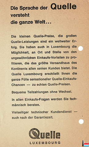 | 17.11.1962 | Ouverture - Eröffnung: Quelle, Luxembourg-Gare, 12 avenue de la Gare |