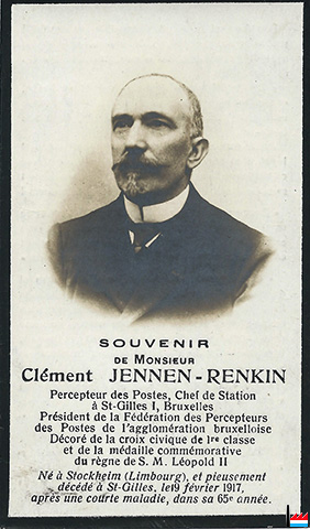 | 1917 | ![]() Monsieur Clément Jennen-Renkin - Percepteur des Postes - Chef de Station à St-Gilles I, Bruxelles - † à St-Gilles, le 19 février 1917, dans sa 65e année. - Collection famille Aschman-Bodson, Luxembourg |