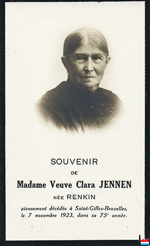 | 1923 | ![]() Madame Veuve Clara Jennen, née Renkin - † à Saint-Gilles-Bruxelles, le 7 novembre 1923, dans sa 75e année. - Collection famille Aschman-Bodson, Luxembourg |