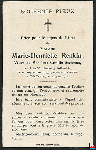 | 1922 | ![]() Marie-Henriette Renkin, Veuve de Monsieur Camille Aschman, † à Ettelbruck, le 26 juin 1922. - Collection famille Aschman-Bodson, Luxembourg |