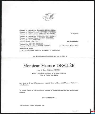 | 1970 | ![]() Maurice Desclée, veuf de Dame Madelaine Renkin, † à Uccle, le 11 janvier 1970. - Collection famille Aschman-Bodson, Luxembourg |