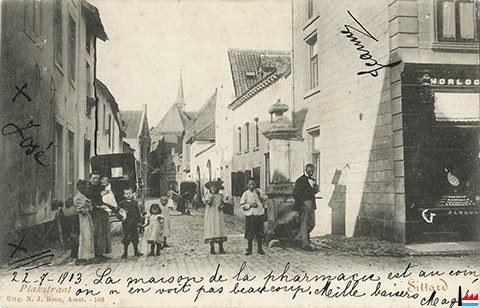 22.7.1903: Plakstraat - Sittard: La Maison de la pharmacie est au coin, on n’en voit pas beaucoup. Mille baisers, Magda, José, Jeanne. - 22-7-1903.
