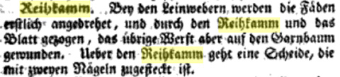 Kommt was Wort Reykem von Reihkamm (oder Reedekamm) ? Reihkamm = Bei den Leinwebern werden die Fäden erstlich angedreht, und durch den Reihkamm und das Blatt gezogen, das übrige Werft aber auf den Garnbaum gewunden. Über den Reihkamm geht eine Scheide, die mit zweien Nägeln zugesteckt ist. Reihkamm = kammartige Vorrichtung am Webstuhl, durch welchen die angedrehten Fäden gezogen werden (Info: jmo 22.3.2020) |
