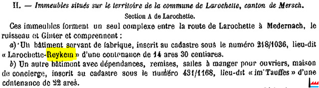 Immeubles de Heintz Van Landewyck situés sur le territoire de la commune de Larochette, canton de Mersch. Section A de Larochette. Ces immeubles forment un seul complexe entre la route de Larochette à Medernach, le ruisseau et Ginter et comprennent : a) Un bâtiment servant de fabrique, inscrit au cadastre sous le numéro 218/1036, lieu-dit « Larochette-Reykem » d'une contenance de 14 ares 30 centiares. b) Un autre bâtiment avec dépendances, remises, salles à manger pour ouvriers, maison de concierge, inscrit au cadastre sous le numéro 431/1168, lieu-dit «im Tauffes» d'une contenance de 22 ares (Mémorial: 23 août 1911. N° 55) |