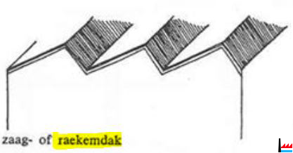 C'est un toit 'raikem' Généralement on dit que l'ingénieur et architecte William Fairbairn aurait formulé le principe vers 1827. On utilisait / utilise en Flandre le mot rekkem-dak (toit rekkem) pour une toiture à shed. Dans l'inventaire du patrimoine en Flandre (jadis paru dans les livres 'Bouwen door de eeuwen heen') on utilise: