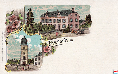 Mersch: Tour St. Michel - Château des Seigneurs de Mersch - Eglise décanale de Mersch - Gare de Mersch - Ecoles primaires Merschoises <=1901 (Carte postale: Verlag A.W. Rosenzweig, Luxemburg; collection: industrie.lu)