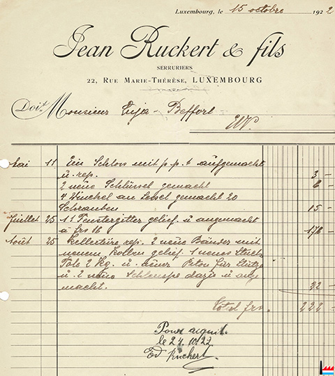 | <=10.1922 | ![]() Jean Ruckert & fils, serruriers, Luxembourg, 22 rue Marie-Thérèse - facture du 15.10.1922 à Luja-Beffort, Luxembourg (Collection: industrie.lu) |