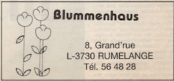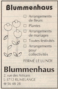 Im Jahre 1992 eröffnete Fräulein Danielle Wampach in der Handwerkerstraße Nr. 2 (rue des artisans) ein Blumengeschäft. Ein Jahr später finden wir dieses Geschäft in der Großstraße Nr. 8 (Grand-rue) |