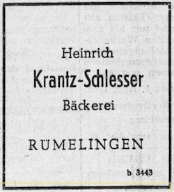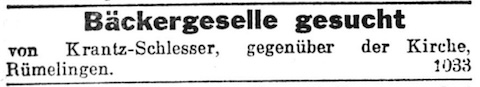 Nach den Osterfeiertagen eröffnete Hr. Paul Krantz-Roth in der Rümelinger Großstraße ein Fachgeschäft für Fischereiausrüstung jeder Art. …Verkaufsraum dessen Fläche zirka 50 qm begreift…. Bei dem Immöbel handelt es sich um einen Neubau, welcher von Hrn. Paul Krantz an der Stelle des elterlichen Bäckereibetriebes Henri Krantz-Schlesser errichtet wurde. Die ehemalige Bäckerei Krantz in welcher schon Großvater Mich. Krantz für die Rümelinger Bergmannsfamilien Brot buk, war älter als die gegenüberliegende Pfarrkirche. Das ansehnliche Geschäftsimmöbel wurde im vergangenen Herbst von der ortsansässigen Unternehmerfirma Jos. Poeckes komplett abgetragen und nach Plänen von Fr. Achten neuerrichtet. Den Plattenbelag besorgte die Firma Decker-Ries, Esch-Alzette, die Gipserarbeiten J.P. Bourscheid, Tetingen, die sanitären Installationen Albert Seywert, die Klempnerarbeiten Jos. Riha, die Schreinerei Henri Kucment, die Schlosserei Roger Graas resp. die Firma Weisgerber, Luxemburg, die elektrischen Installationen Henri John, Kayl. Nic. Fedler brachte den Bau unter Dach, während Renz Cinello für einen gediegenen Anstrich sorgte. …. Durch die lobenswerte Initiative von Hrn. Paul Krantz erfährt das Rümelinger Geschäftsleben eine merkliche Bereicherung. Dem neuen Fachgeschäft sei ein voller kommerzieller Erfolg beschieden. |