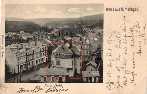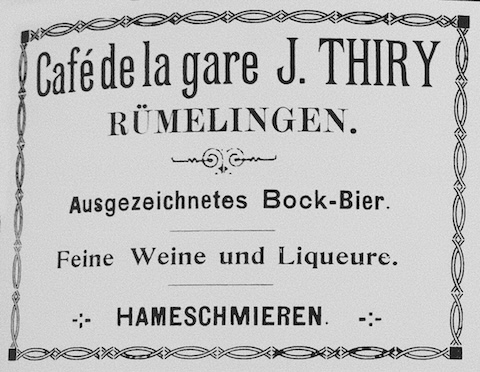 | Volkszählung Rumelange 1900 Thiry Joseph, Vater, * 8.2.1859 Forbach, Gastwirt, seit 4 Jahren anwesend Ney Caroline, Mutter, * 9.10.1859 Forbach Thiry Jules, Sohn, * 9.6.1883, Mechaniker Thiry Charles, Sohn, * 23.9.1884 Thiry Jeanne, Tochter, * 14.4.1887 Forbach Thiry Louise, Tochter, * 26.2.1895 Forbach Thiry Léon, Sohn, * 3.3.1890 Forbach, seit 5 Wochen Student in Juvigny (F) |