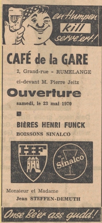 Café der la Gare 2, rue de la Gare Ouverture vendredi, le 15 mars 1974 à partir de 20 heures. Bières Henri Funck, Boissons Sinalco M. et Mme A. Franquillo-Carpisassi |