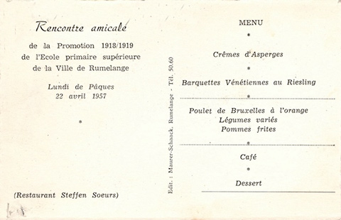 Rümelingen, Konveniat der Amicale Gembitz-Deutschwalde. Am vergangenen Samstag trafen sich die ehemaligen Zwangsrekrutierten der Arbeitsdienstlager Gembitz und Deutschwalde im Minettestädtchen Rümelingen zu ihrem jährlichen Konveniat. …einem Mittagessen in der „Hostellerie de la Poste“, bei dem die Rümelinger „Minettsble’ser für gute Stimmung sorgten… Bei Kamerad Jeng Steffen am Bahnhof klang der Tag aus bei angeregter Unterhaltung und einer „assiette maison“… |