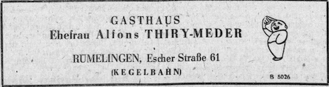 Am Donnerstag den 12. Februar 1953, um 15 Uhr, läßt Herr Wilh. Thinnes-Kieffer, Landwirt zu Eppeldorf, öffentlich für erblich versteigern: Ein leerstehendes doppeltes Wohn- und Geschäftshaus mit Kegelbahn, Platz und Garten, gelegen zu Rümelingen, Escherstraße Nr. 61, eingetr. im Kataster unter Nr. 1132/4, mit einer Gesamtfläche von ca, 6 Ar 31, sowie 1/3 an einem unter Nr. 1132/31 eingetr. Weg von ca 91 Ca. Dasselbe enthält im Erdgeschoß geräumiges Geschäftslokal, Küche und 2 Zimmer. Auf dem 1. Stock 4 Zimmer. Ferner 3 Mansarden, Speicher, Waschküche und 2 abgetrennte Keller. Gas, Wasser, Elektrizität, Kanalanschluß. In deisem Hause wurde seit langen Jahren Wirtschaft betrieben. Die Wanderkonzession und das Wirtschaftsmobiliar begr. 8 Tische, 20 Stühle, 1 Comptoir mit chromierter Tischplatte, sämtliche Gläser, 2 Bänke, 2 Bilder, 2 Oefen werden seitens der Brauerei jedem Liebhaber zediert. Wirklicher Genußantritt sofort. Zur Besichtigung sich wenden im Hause selbst: jeden Donnerstag und Sonntag nachmittags inkl. den 12. Febr. Gute Kapitalanlage, denn das Ganze läßt sich leicht für 2 Familienwohnungen von 6 oder 7 Zimmer einrichten. Esch-Alzette, den 24. Januar 1953. René Wagner, Notar. |