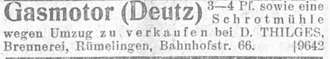 Prima Korn- und Apfelbranntwein garantiert rein 50% hat fortwaehrend abzugeben Brennerei D. Thilges, Rümelingen |