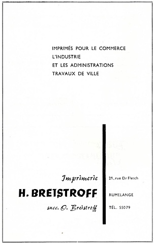 | 1957 | Rümelingen. Neubauten unserer Stadt. …Der Buchdruckermeister Oscar Breistroff hat nunmehr seinen Wohnsitz aus der Rathausstraße (heute rue Nic. Pletschette) in seinen Neubau in der Dr. Flesch-Straße verlegt... |